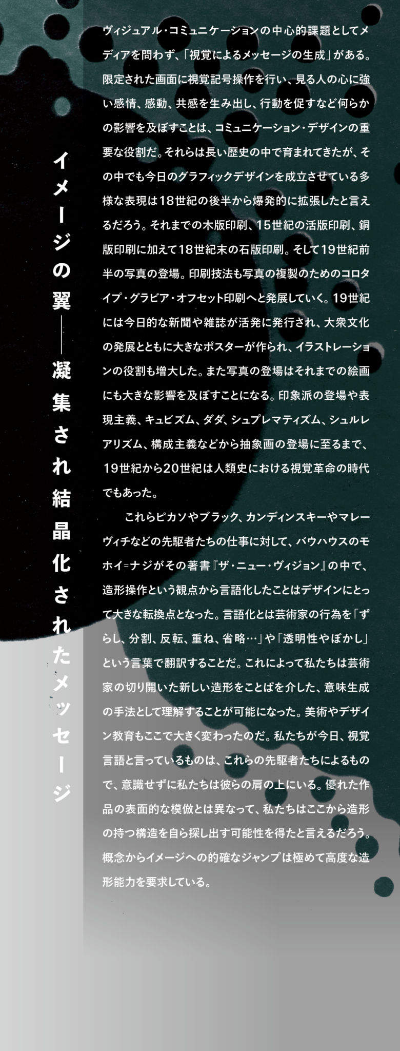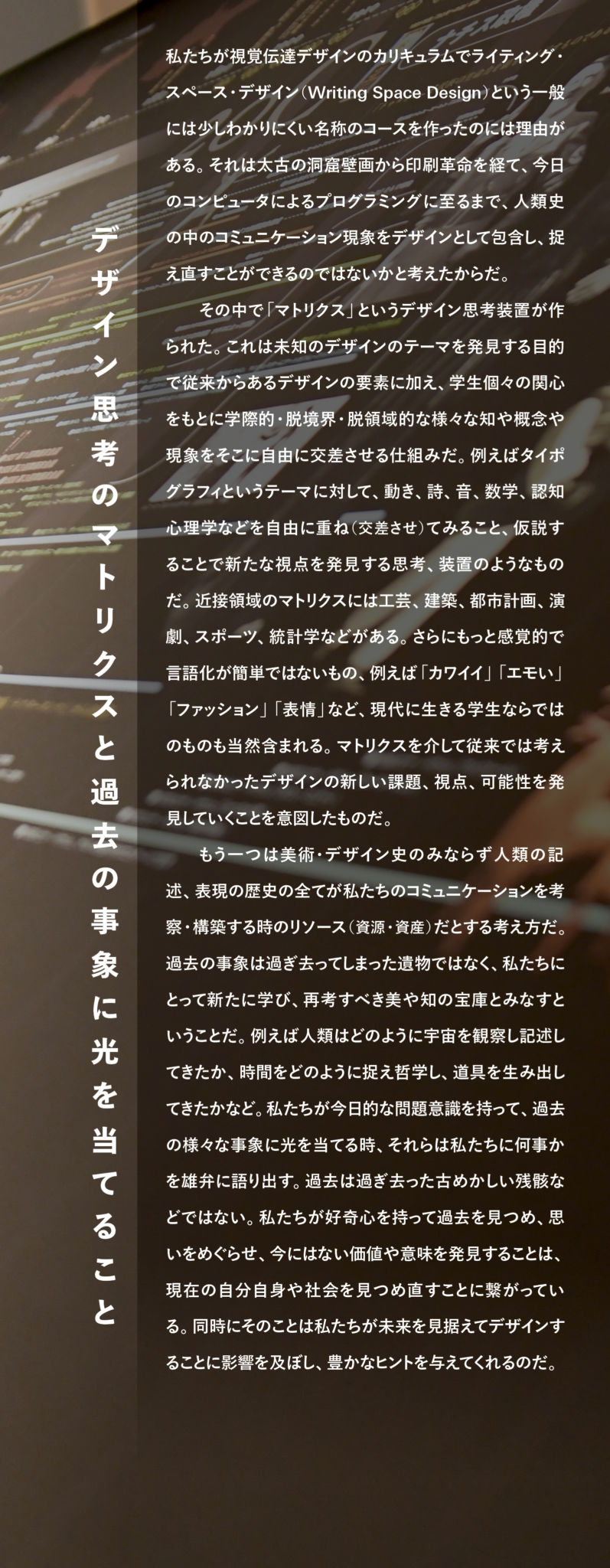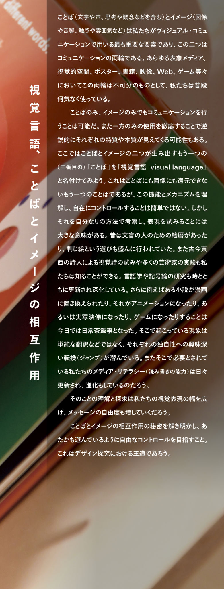 下記のテキストは2020年に「ヴィジュアル・コミュニケーション・デザイン・スタディ─視覚伝達デザイン学科研究室が目指すもの」(武蔵野美術大学出版局刊)の編集を行なった時にこれまでの学生とのコラボレーションと自分の研究を重ね合わせながら、現時点でデザインの可能性、その射程を言葉にして見たものである。全部で15の章になった。